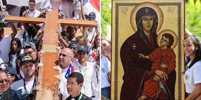 E, “desde 2000 que a cruz peregrina conta com a companhia do ícone de Nossa Senhora Salus Populi Romani, que retrata a Virgem Maria com o Menino nos braços”.
